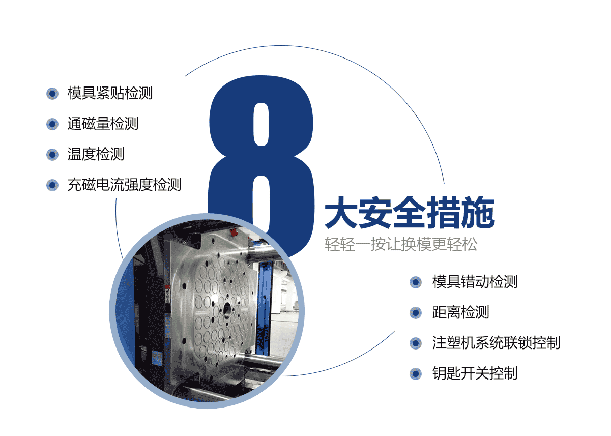 • 電永磁磁力模板只需一名操作員,無(wú)需其他工具,就可以在距注塑機(jī)安全距離的磁力系統(tǒng)上執(zhí)行操作。 大大降低人工成本和勞動(dòng)強(qiáng)度。